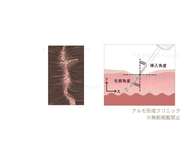 - 患者様ごとに生え癖、毛流、毛の角度など特徴は異なります。アルモUn-SHAVEN法では、患者様ごとに沿ったデザインを提供します。