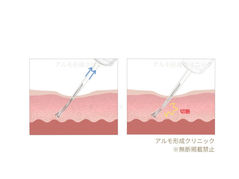 他院では、カットせずに採取をするため、切断率が高くなってしまいます。また、プレカット法を用いてはいるが、採取する範囲のバランスが悪く、目立ちやすくなるケースもございます。当院では、プレカット法により低い切断率を実現していることに加え、採取する範囲を適切に設定するため、バレるリスクがほとんどありません。